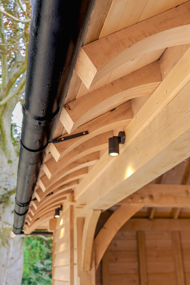 The layout of these complex outbuildings can be highly customised. L-shaped or T-shaped oak frame designs not only optimise space but can also enhance the overall visual appeal of the property. These configurations can create a sense of flow and continuity within the landscape, making them functional and integral parts of the main estate. If required, creating a spacious upper-level room above the garage is particularly appealing, offering a potential accommodation for guests or staff, office space, or a tranquil retreat while keeping the main living area free from clutter.