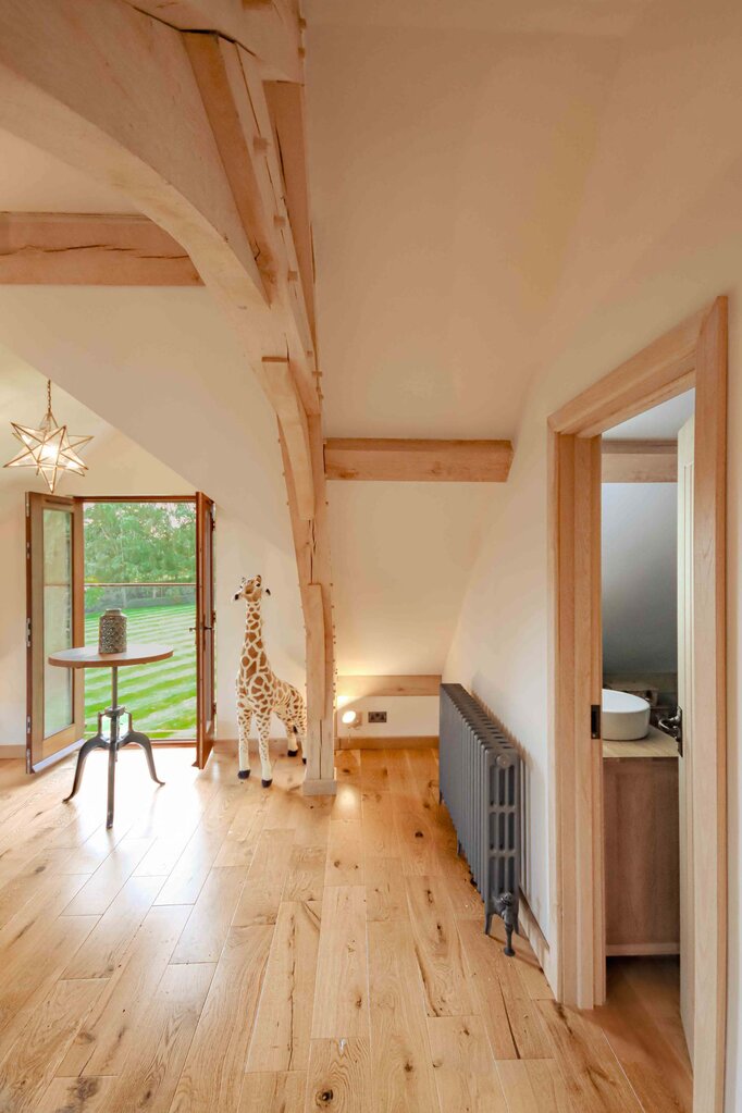 A display of oak craftsmanship continues above in the upper-level living space. Three prominent feature oak trusses take centre stage, adding both structural integrity and visual grandeur to the room. A notable feature of this space is a large, glazed Juliet dormer balcony, which creates an airy and light-filled environment. A bar stool is positioned in front of the balcony, ideally for enjoying a morning coffee or an evening glass of wine while taking in the panoramic views of the expansive gardens and rolling countryside beyond.