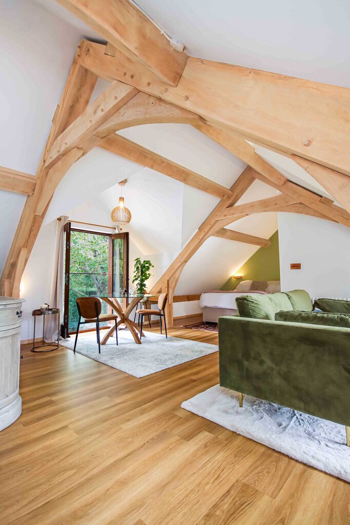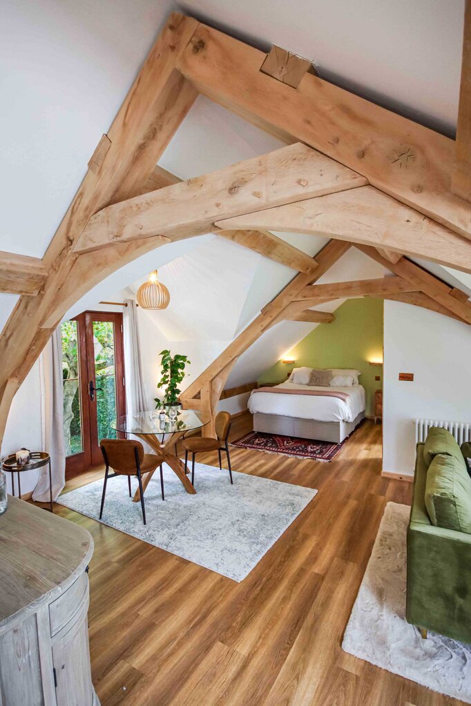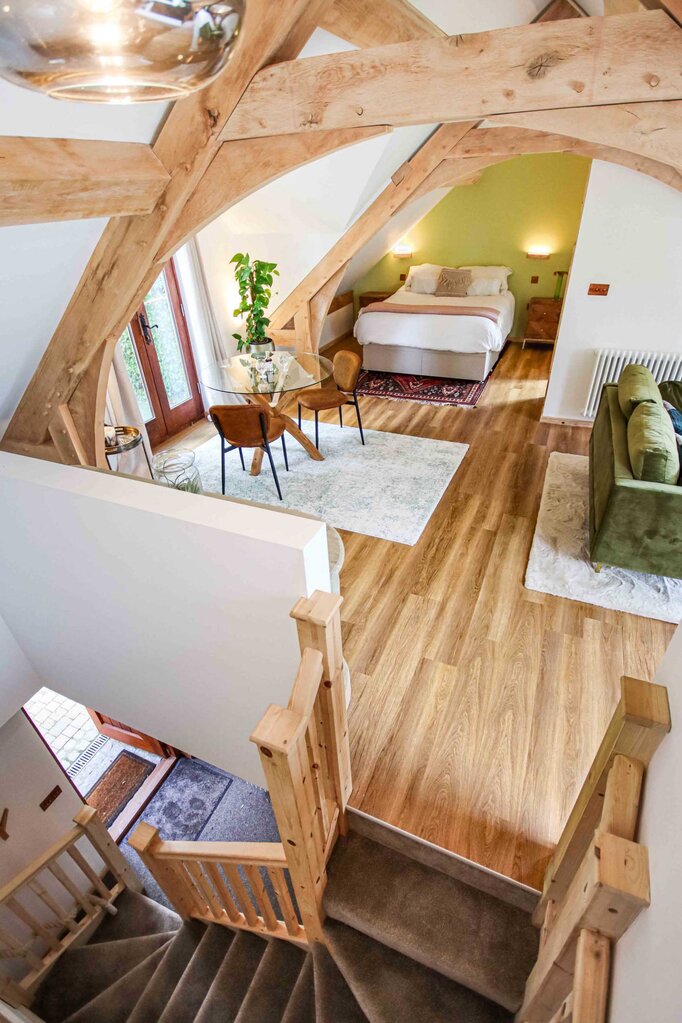 The dual Juliette balconies create a warm and inviting atmosphere in the bedroom, and the living space is bathed in natural light. This room above area is surrounded by feature oak work and is fitted out as a guest suite, providing visiting friends or family members with a private and comfortable retreat. The kitchenette is compact yet highly functional, equipped with modern appliances and sufficient storage to ensure convenience and practicality for short, or long-term stays. Meanwhile, the shower room is fitted with high-quality fixtures and elegant tiling, offering a luxurious and refreshing space for guests or residents.